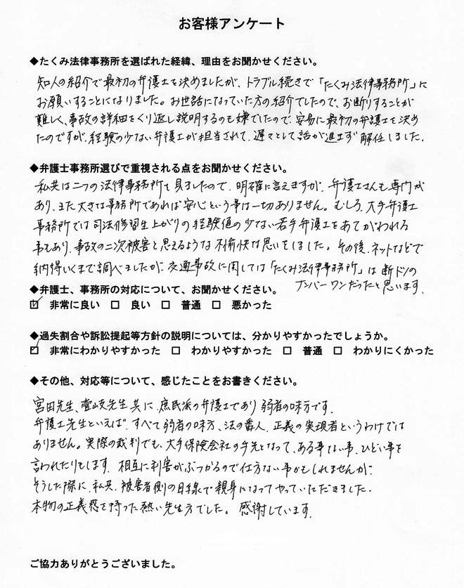 交通事故案件(被害者側)をご相談させて頂いた際、とても親身になって対応していただきました。