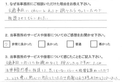1.当事務所へご相談いただいたきっかけを教えてください。 交通事故に詳しいとネットで調べたらのっていたので相談させてもらいました。 2.当事務所のサービスや接客について感じたことをご記入ください。 交通事故に対しての知識がなくて不安だったのですが、たくみ法律事務所様に相談して、思ってもないくらいの賠償金額がいただけて。 とても優しく熱心に対応していただき、感謝しております。ありがとうございました。 |
