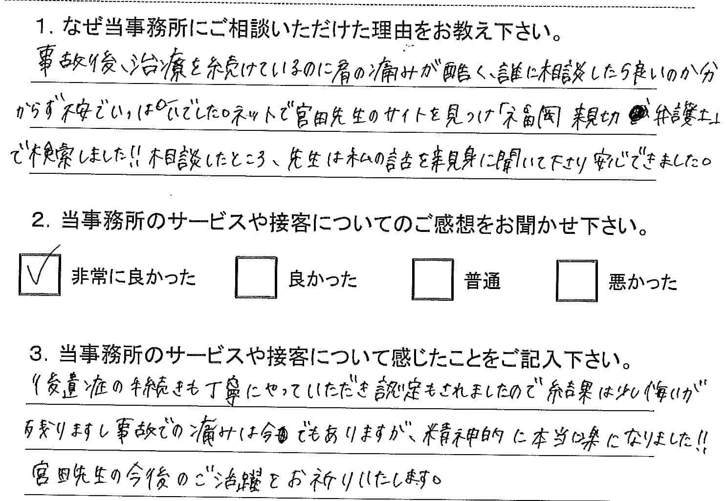 1.当事務所へご相談いただいたきっかけを教えてください。 事故後、治療を続けているのに肩の痛みが酷く、誰に相談したら良いのか分からず不安いっぱいでした。 ネットで宮田先生のサイトを見つけ「福岡 親切 弁護士」で検索しました!! 相談したところ、先生は私の話を親身に聞いて下さり安心できました。 2.当事務所のサービスや接客について感じたことをご記入ください。 後遺症の手続きも丁寧にやっていただき認定もされましたので結果は少し悔いが残りますし事故での痛みは今でもありますが、精神的に本当に楽になりました!! 宮田先生の今後のご活躍をお祈りいたします。 |