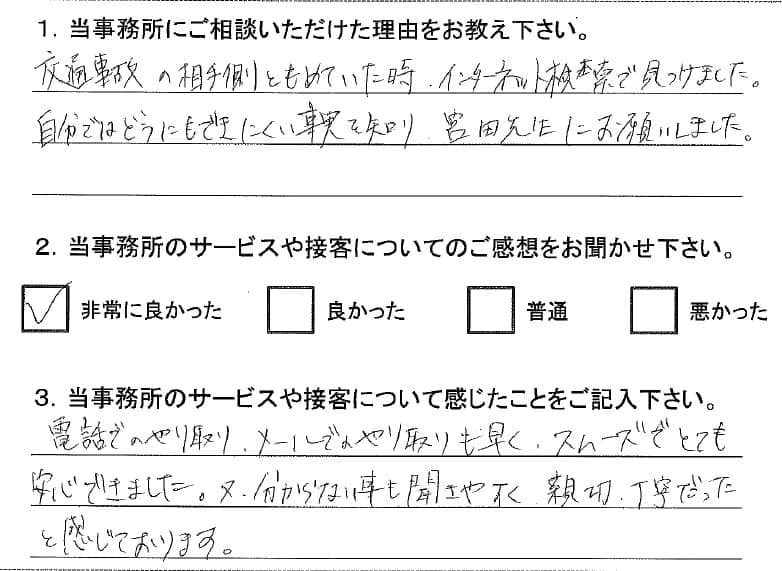 1.当事務所へご相談いただいたきっかけを教えてください。 交通事故の相手側ともめていた時、インターネット検索で見つけました。自分ではどうにもできにくい事実を知り、宮田先生にお願いしました。 2.当事務所のサービスや接客について感じたことをご記入ください。 電話でのやり取り、メールでのやり取りも早く、スムーズでとても安心できました。又、分からない事も聞きやすく、親切・丁寧だったと感じております。 |