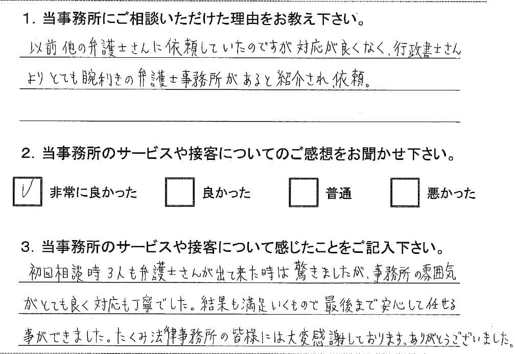 1.当事務所へご相談いただいたきっかけを教えてください。 以前他の弁護士さんに依頼していたのですが対応が良くなく、行政書士さんよりとても腕利きの弁護士事務所があると紹介され、依頼。 2.当事務所のサービスや接客について感じたことをご記入ください。 初回相談時3人も弁護士さんが出て来た時は驚きましたが、事務所の雰囲気がとても良く対応も丁寧でした。 結果も満足いくもので最後まで安心して任せる事ができました。たくみ法律事務所の皆様には大変感謝しております。 ありがとうございました。 |