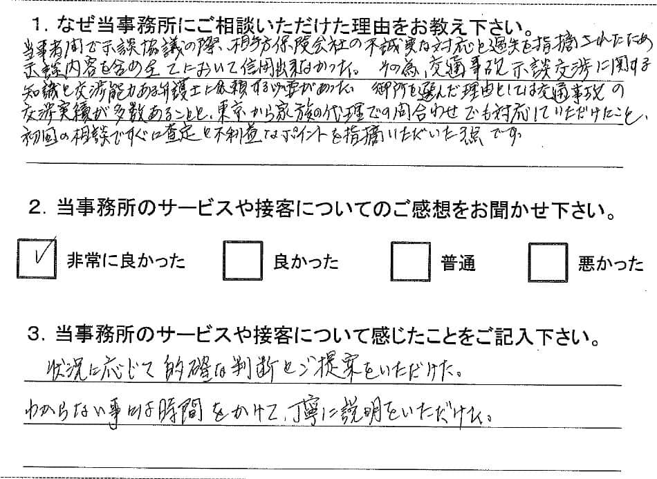 1.当事務所へご相談いただいたきっかけを教えてください。 当事者間で示談協議の際、相手方保険会社の不誠実な対応と過失を指摘されたため示談内容を含め全てにおいて信用出来なかった。 その為、交通事故示談交渉に関する知識と交渉能力ある弁護士に依頼する必要があった。 御所を選んだ理由としては交通事故の交渉実績が多数あることと、東京から家族の代理での問合せでも対応していただけたこと、初回の相談ですぐに査定と不利益なポイントを指摘いただいた3点です。 2.当事務所のサービスや接客について感じたことをご記入ください。 状況に応じて的確な判断とご提案をいただけた。 わからない事には時間をかけて丁寧に説明をいただけた。 |