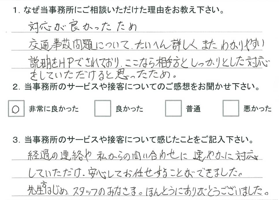 1.当事務所へご相談いただいたきっかけを教えてください。 対応が良かったため 交通事故問題について、たいへん詳しくまたわかりやすい説明をHPでされており、ここなら相手方としっかりとした対応をしていただけると思ったため。 2.当事務所のサービスや接客について感じたことをご記入ください。 経過の連絡や、私からの問い合わせに速やかに対応していただけ、安心してお任せすることができました。 先生方はじめ、スタッフのみなさま、ほんとうにありがとうございました。 |