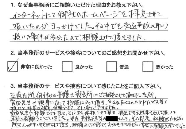 1.当事務所へご相談いただいたきっかけを教えてください。 インターネットにて御社のホームページを拝見させていただいたのが、きっかけでした。その中でも交通事故の取扱いの案件が多かったので、相談させていただきました。 2.当事務所のサービスや接客について感じたことをご記入ください。 正直な所、何件かの弁護士事務所にご相談させて頂きました所、宮田先生が親身になって相談にのって頂き、色々な沢山のアドバイス等を頂けて、非常に信用、信頼できて、そして安心できました。 宮田先生に相談させて頂き、そしてまた依頼させて頂き、満足できる結果を出して頂いて本当に有難うございました。また担当事務の方も、その都度私自身がわからない所も、しっかりと説明をして頂き、納得のいく形でお任せできました。本当に有難うございました。 |