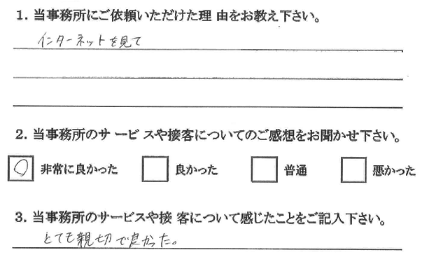 1.当事務所へご相談いただいたきっかけを教えてください。 インターネットを見て。 2.当事務所のサービスや接客について感じたことをご記入ください。 とても親切で良かった。 |