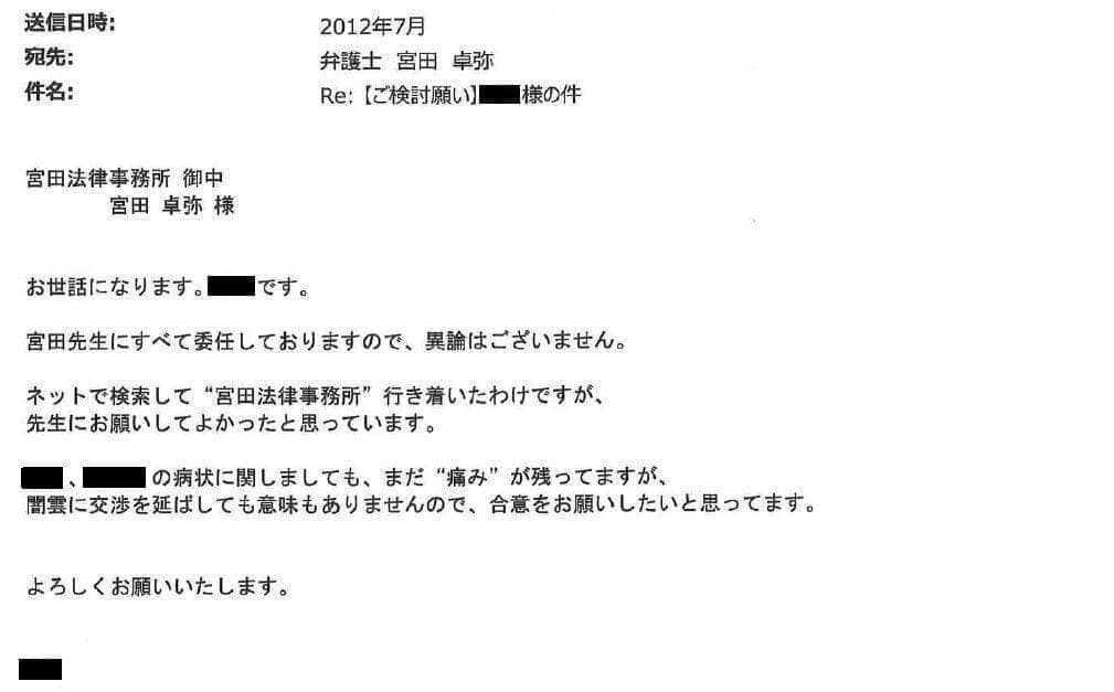 宮田先生にすべて委任しておりますので、異論はございません。 ネットで検索して、”弁護士法人 たくみ法律事務所”に行き着いたわけですが、先生にお願いしてよかったと思っています。 病状に関しましても、まだ”痛み”が残ってますが、闇雲に交渉を延ばしても意味もありませんので、合意をお願いしたいと思ってます。 よろしくお願いいたします。 |