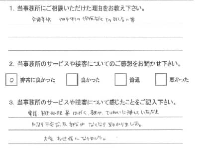 交通事故 相手方の保険会社との話し合い等 2.当事務所のサービスや接客について感じたことをご記入ください。 弁護士電話、事務処理などはやく、親切、ていねいに接していただきかなり不安だった部分がなくなり助かりました。 大変お世話になりました。 |