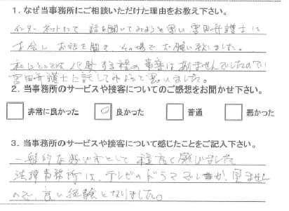 1.当事務所へご相談いただいたきっかけを教えてください。 インターネットにて話を聞いてみようと思い、宮田弁護士にお会いしお話を聞き、その場でお願い致しました。 私にとっては、比較する程の事案はありませんでしたので宮田弁護士に話してみようと思いました。 2.当事務所のサービスや接客について感じたことをご記入ください。 一般的な感じ方として程良く感じました。 法律事務所は、テレビのドラマでしか見ませんので、良い経験となりました。 |