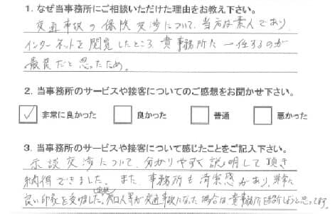 1.当事務所へご相談いただいたきっかけを教え てください。 交通事故の保険交渉について、当方は素人であり、インターネットを閲覧したところ、貴事務所に一任するのが最良だと思ったため。 2.当事務所のサービスや接客につい て感じたことをご記入ください。