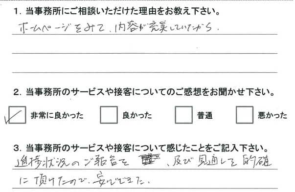 1.当事務所へご相談いただいたきっかけを教えてください。 ホームページをみて、内容が充実していたから。 2.当事務所のサービスや接客について感じたことをご記入ください。 進捗状況のご報告を、及び見通しを的確に頂けたので安心できた。 |