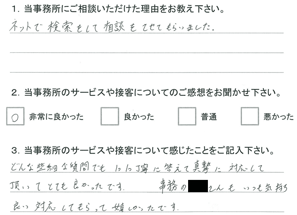 1.当事務所へご相談いただいたきっかけを教えてください。 ネットで検索をして相談をさせてもらいました。 2.当事務所のサービスや接客についてのご感想をお聞かせ下さい。 |