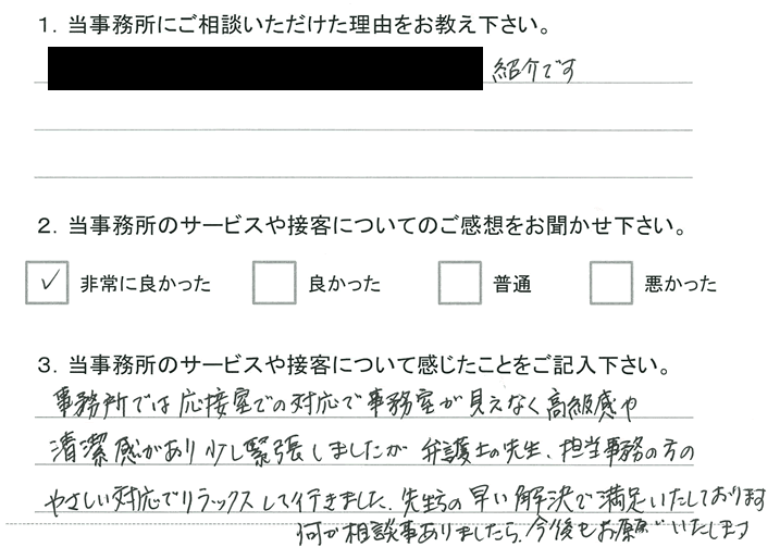 1.当事務所へご相談いただいたきっかけを教えてください。 紹介です 2.当事務所のサービスや接客についてのご感想をお聞かせ下さい。 |