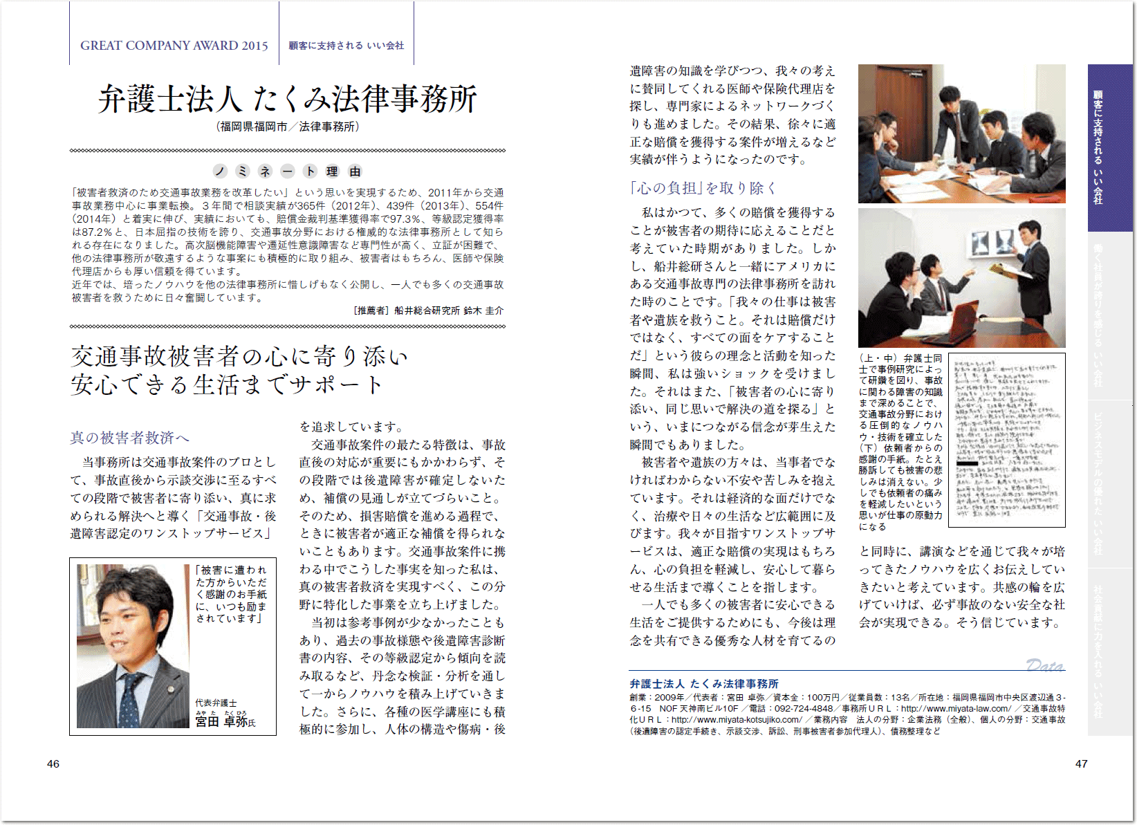 日本で有数の経営コンサルティング会社である株式会社船井総合研究所が年に1度、社会に著しい貢献が期待できる法人を表彰する「グレートカンパニーアワード2015」にて、当事務所が「交通事故被害者の心に寄り添い、安心できる生活までサポート」するグレートカンパニーとして、収益性、教育性、社会性に優れたいい会社として、およそ8,000社の中から各業界別に選りすぐるられた31社にノミネートされました。