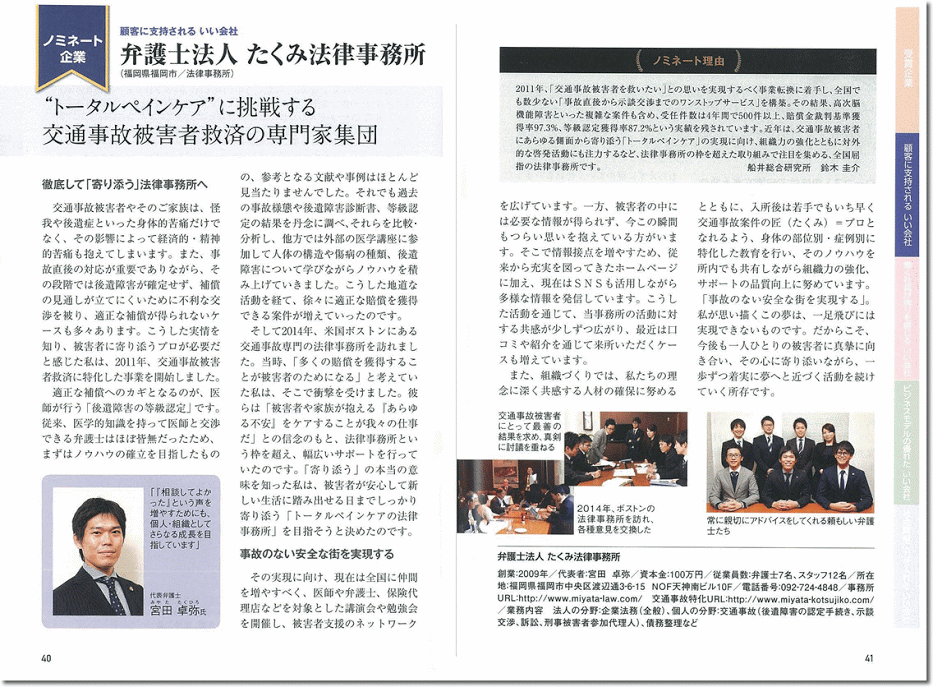 日本で有数の経営コンサルティング会社である株式会社船井総合研究所が主催する「グレートカンパニーアワード2016」にて、当事務所が「トータルペインケアに挑戦する交通事故被害者救済の専門家集団」として、およそ8,000社の中から各業界別に選りすぐられた28社に、『顧客に支持されるいい会社』として、2014年、2015年に引き続き、数ある法律事務所の中で唯一の選出、3年連続のノミネートとなりました。